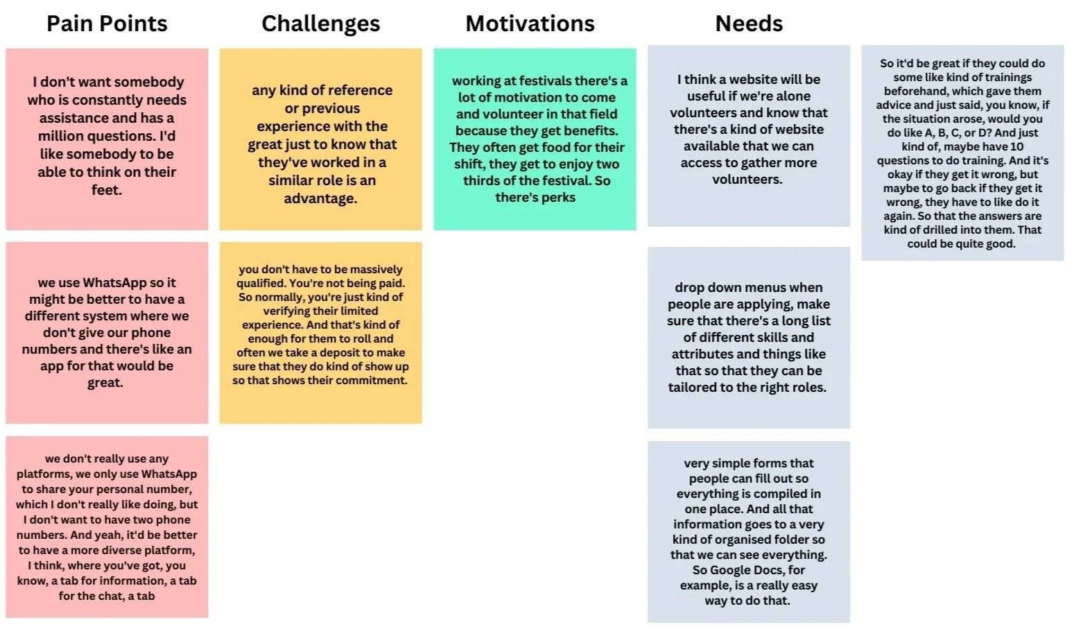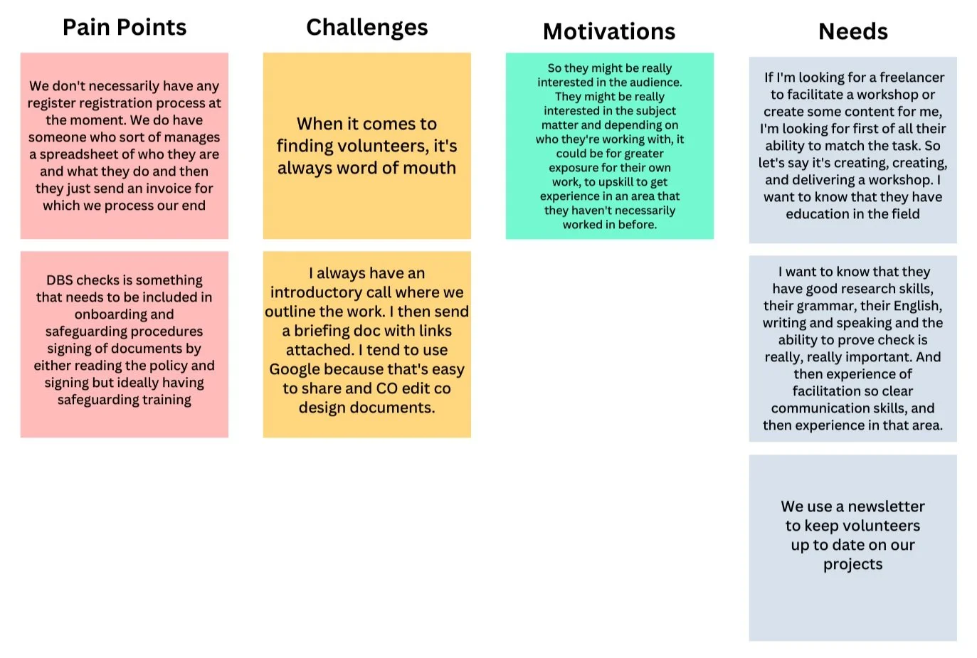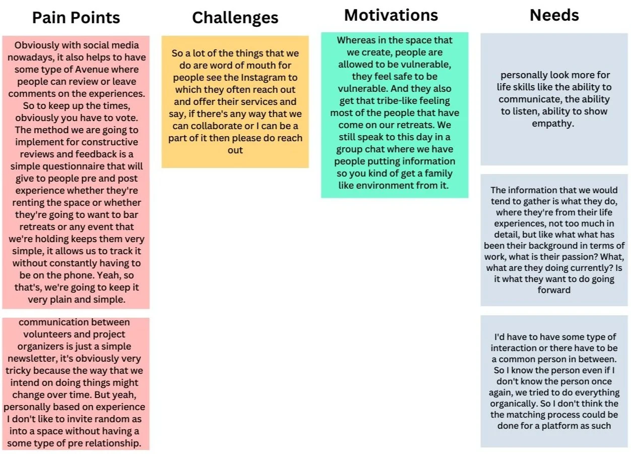I conducted four interviews with professionals and volunteers to uncover insights into their pain points, challenges, motivations and needs, guiding the design process effectively.