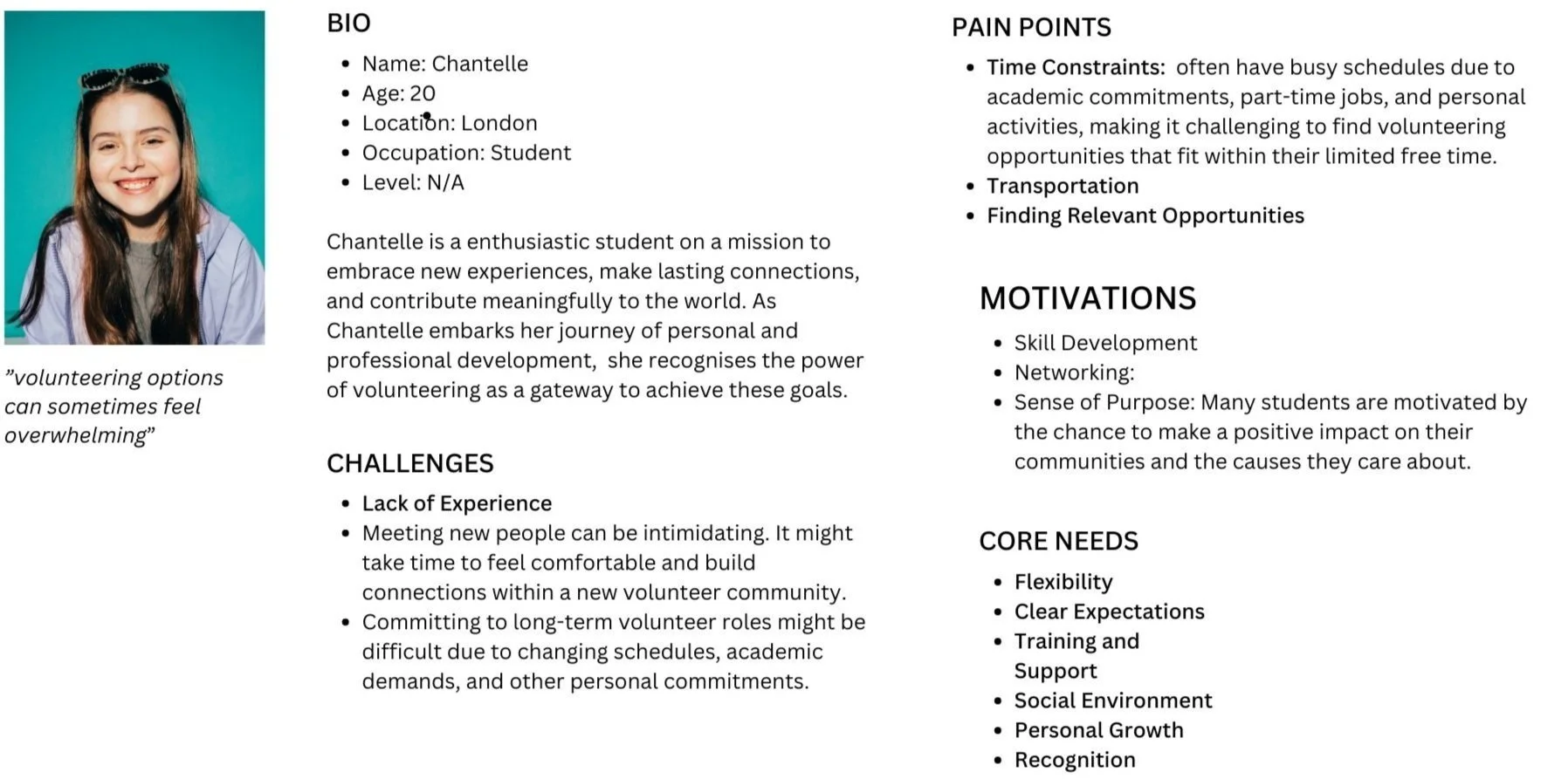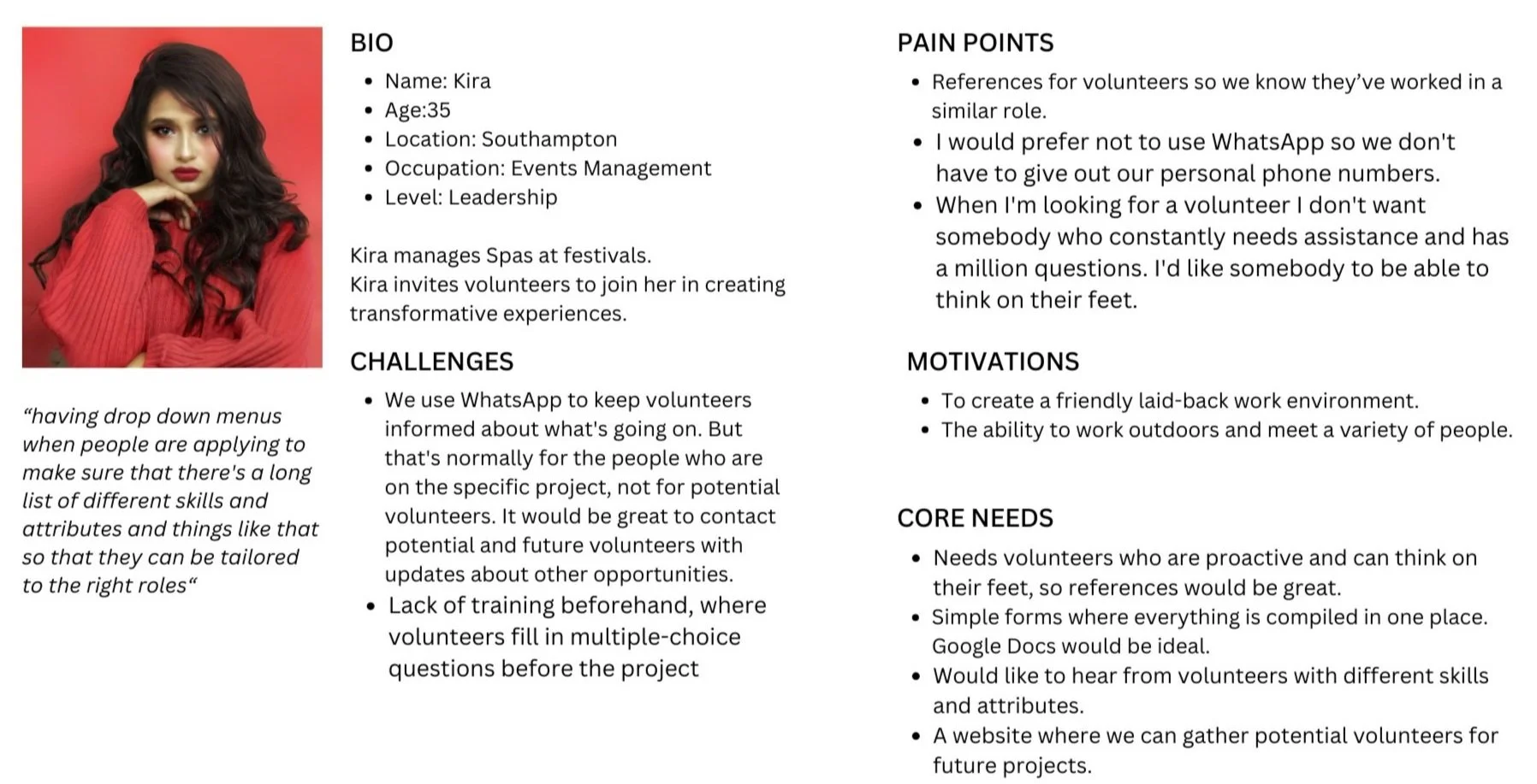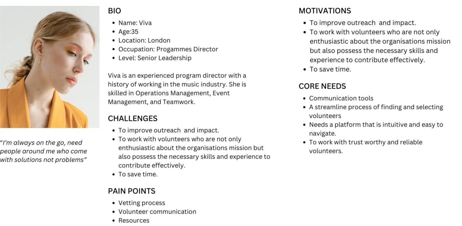 I discovered that the most promising area for design lies within Viva's pain points, specifically the vetting process, volunteer communication, and resource sharing. By focusing on these areas, we can streamline the application process for volunteers and seamlessly integrate it into the organisation's workflow. Additionally, I can identify the specific steps within the process where vetting checks ought to be implemented and figure out the most effective way to notify volunteers about these checks. This holistic approach will ensure a smoother and more efficient experience for both the volunteers and the organisation.